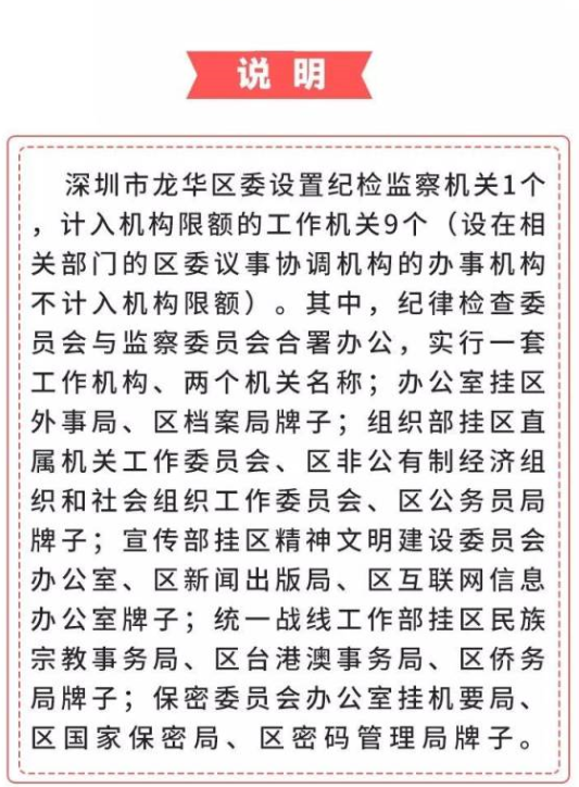 近日,《深圳市龍華區(qū)機構(gòu)改革方案》(以下簡稱“方案”)經(jīng)省委批準,以省委機構(gòu)編制委員會名義正式印發(fā)。2月14日,區(qū)委召開一屆六次全會,對全區(qū)深化機構(gòu)改革工作進行動員部署,龍華區(qū)機構(gòu)改革工作進入全面實施階段。