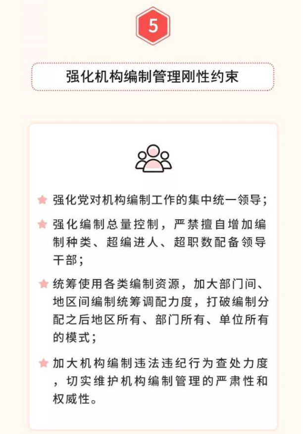 五是全面落實優(yōu)化協(xié)同高效原則。堅持一件事情原則上由一個部門負責,把理順職責放在重要位置,從有利于突出主業(yè)、有利于服務管理的角度出發(fā),實事求是,科學設(shè)置黨委和政府機構(gòu),宜大則大、宜小則小,該加強的加強、該精簡的精簡、該優(yōu)化的優(yōu)化,實現(xiàn)機構(gòu)職責的深度融合。