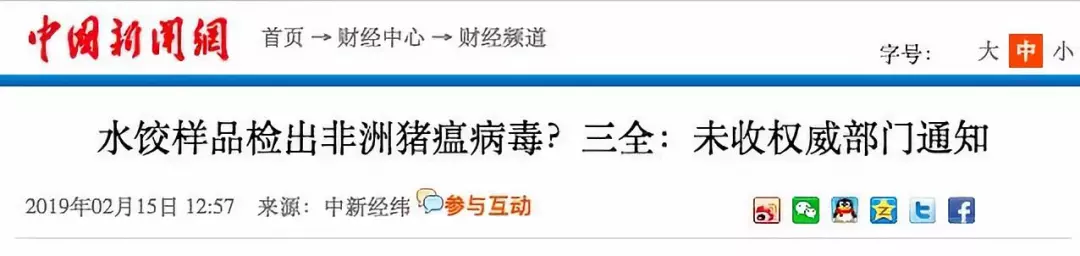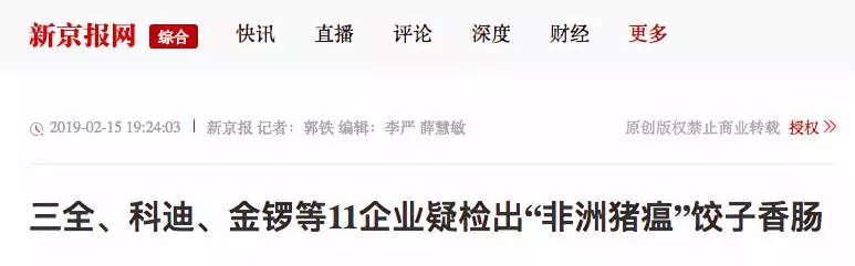 據(jù)紅星新聞報道,多家媒體稱,2月9日,湖南省湘西自治州重大動物疫病防制指揮部辦公室接到省防治重大動物疫病指揮部辦公室通知,要求瀘溪縣重大動物疫病防制指揮部辦公室對來源于吉首市凌云冷凍食品批發(fā)部凍庫的產(chǎn)品進行抽樣,在瀘溪縣好又多和萬家福兩家超市共抽取4個批次12份樣品,經(jīng)州動物疫病預(yù)防控制中心檢測,其中由河南三全食品有限公司生產(chǎn)批次為20190113H的“三全灌湯水餃”3份樣品為非洲豬瘟病毒核酸陽性。