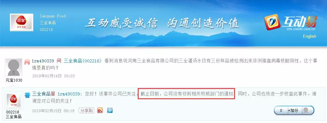 中新經(jīng)緯客戶端報道,14日晚間,有投資者在深交所互動平臺上提問三全食品稱,有消息稱三全灌湯水餃有三份樣品被檢測出非洲豬瘟病毒核酸陽性,該事件是否真實?