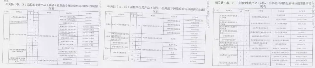 該網(wǎng)友貼出的3張照片顯示為“相關(guān)縣(市、區(qū))送檢的生豬產(chǎn)品(制品)檢測出非洲豬瘟病毒核酸陽性的情況表”,共計11個廠家、40批次產(chǎn)品的83個樣品檢出陽性,采樣地點在甘肅的蘭州市、武陵市、白銀市、酒泉市、金昌市等。被通報的速凍品牌及企業(yè)包括三全、鄭榮、科迪、上海國福龍鳳等,其中標稱河南科迪速凍食品有限公司生產(chǎn)的水餃、肉丸等產(chǎn)品,至少有67份樣品檢出非洲豬瘟病毒核酸陽性,為陽性檢出樣品最多的品牌。