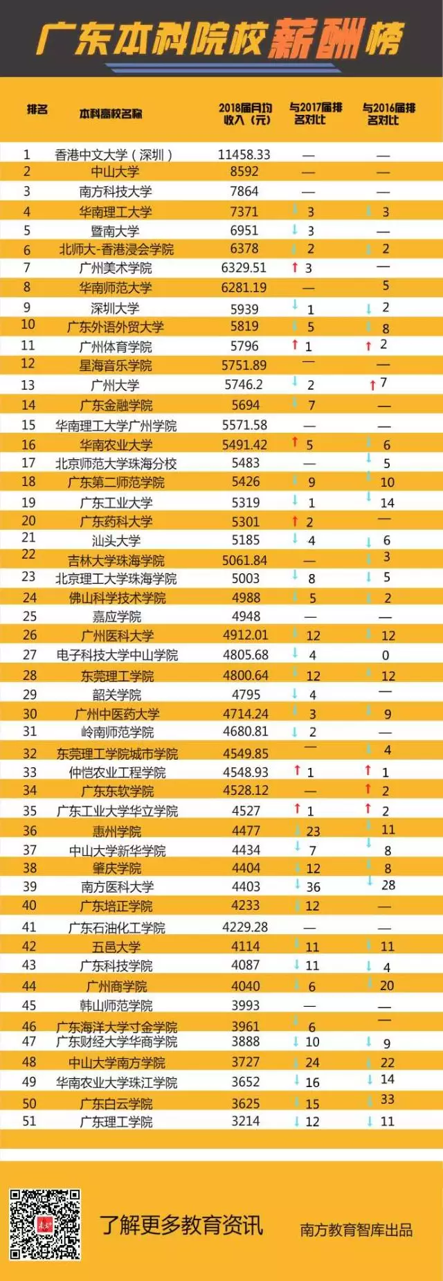 不久前,省教育廳發(fā)布了《2018年高校畢業(yè)生就業(yè)質量年度報告》,全省本科畢業(yè)生平均月薪為4522元。已公布相關數(shù)據的51所本科高校中,有35所超過了全省本科畢業(yè)生的平均月薪,其中中山大學8592元、南方科技大學7864元、華南理工大學7371元名列前3位,均超過7000元。