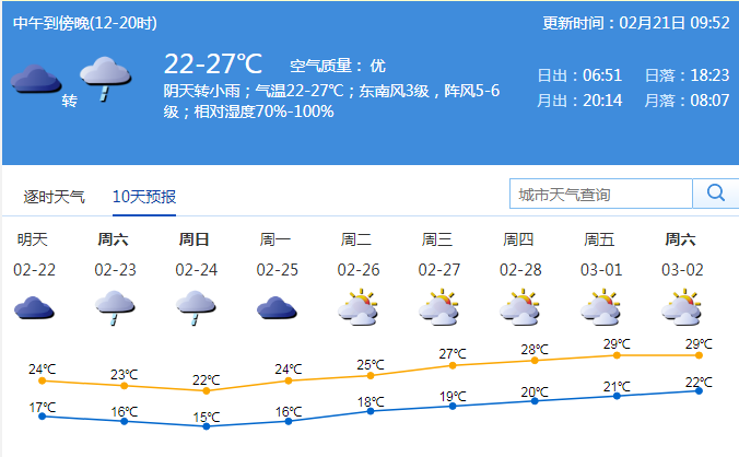 記者從深圳市氣象局了解到,21日深圳市以多云轉(zhuǎn)陰天為主,有分散小雨;氣溫在21-27℃;東南風(fēng)2-3級;相對濕度65%-95%。