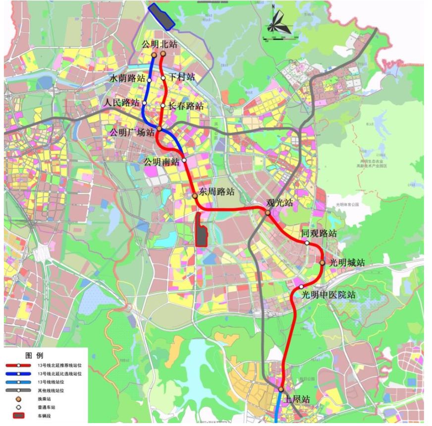 13號(hào)線北延線連接光明鳳凰城、公明中心等地區(qū),并通過已建成運(yùn)營的13號(hào)線連接至南山后海,是聯(lián)系光明新區(qū)與南山中心的市域快線。