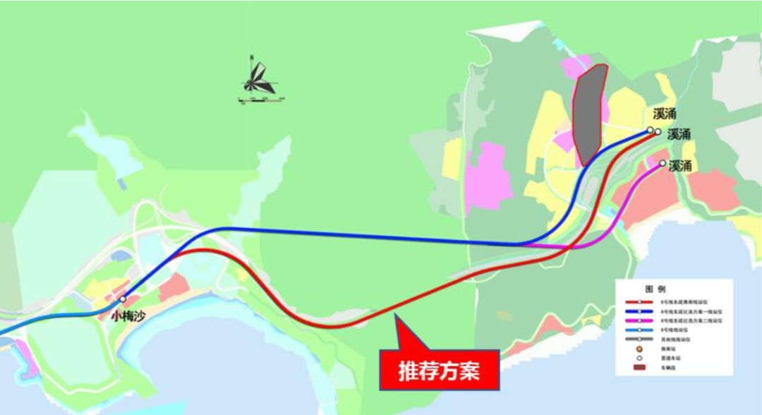 8號(hào)線東延工程起自在建8號(hào)線小梅沙站,沿鹽壩高速敷設(shè),在溪涌路西側(cè)設(shè)溪涌站,與規(guī)劃33號(hào)線換乘,并在溪涌站后引出一股線路接入新建溪涌車輛段內(nèi)。