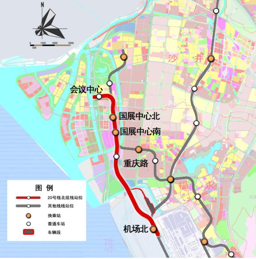 20號(hào)線北段起于寶安國際機(jī)場規(guī)劃 T4航站樓,在規(guī)劃 T4航站樓北側(cè),11號(hào)線東側(cè)設(shè)機(jī)場北站,與11號(hào)線、穗莞深城際線換乘。之后線路往北沿展覽大道敷設(shè),經(jīng)蠔業(yè)路后轉(zhuǎn)向北,于重慶路北側(cè),展覽大道東側(cè)設(shè)重慶路站。線路繼續(xù)往北,沿新會(huì)展中心東側(cè)道路敷設(shè),于景芳路南側(cè)設(shè)國展中心南站,與12號(hào)線換乘,在鳳塘大道路口設(shè)國展中心北站,與12號(hào)線、30號(hào)線換乘。線路自國展中心北站引出后,于和蕙路向東敷設(shè),于海濱大道東側(cè)設(shè)會(huì)議中心站。線路全長約8.4km,采用地下敷設(shè)。