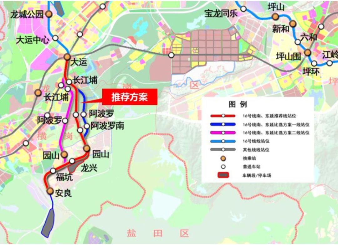 16號(hào)線南延對(duì)于支持重點(diǎn)產(chǎn)業(yè)區(qū)發(fā)展、強(qiáng)化龍崗中心城與橫崗、鹽田的區(qū)域聯(lián)系、構(gòu)筑城際樞紐具有重要意義。線路從大運(yùn)站引出,沿龍崗大道敷設(shè),轉(zhuǎn)入長江埔路并設(shè)長江埔站,然后向南進(jìn)入阿波羅產(chǎn)業(yè)園并設(shè)阿波羅站,繼續(xù)向南進(jìn)入阿波羅產(chǎn)業(yè)區(qū)并設(shè)阿波羅南站,向南進(jìn)入萬福路并設(shè)園山站,然后沿公園路敷設(shè),轉(zhuǎn)入沙荷路在沙荷路與龍興路交叉口設(shè)龍興站,在沙荷路與安業(yè)路交叉口設(shè)??诱?,最后沿惠鹽中路進(jìn)入安良村,設(shè)終點(diǎn)站安良站。線路全長約7.8km,采用地下敷設(shè)。