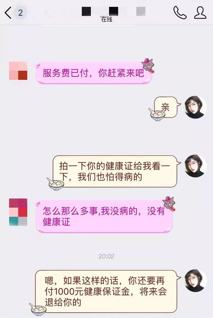 轉賬后,小李同學到一酒店開好房間,靜等“小妹”上門,但此時,對方要求再交1000元“風險押金”才能安排“小妹”過來。