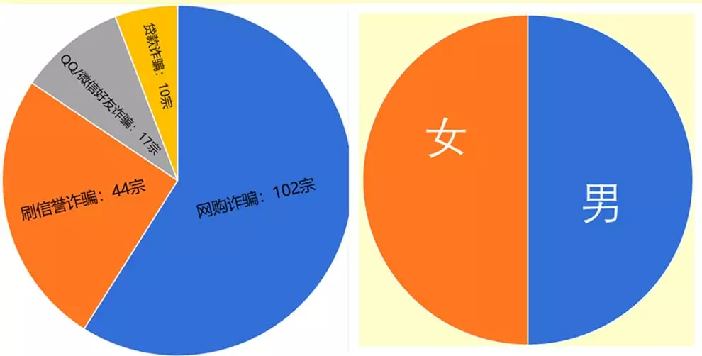 其中,以網(wǎng)購和刷單詐騙占比最大,受害學生男女比例基本持平。