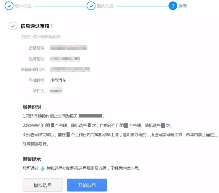 系統(tǒng)核查通過后會進入選號服務說明,用戶可以看到之前提交的信息,閱讀服務說明后,點擊"開始選號"按鈕開始進行選號操作。