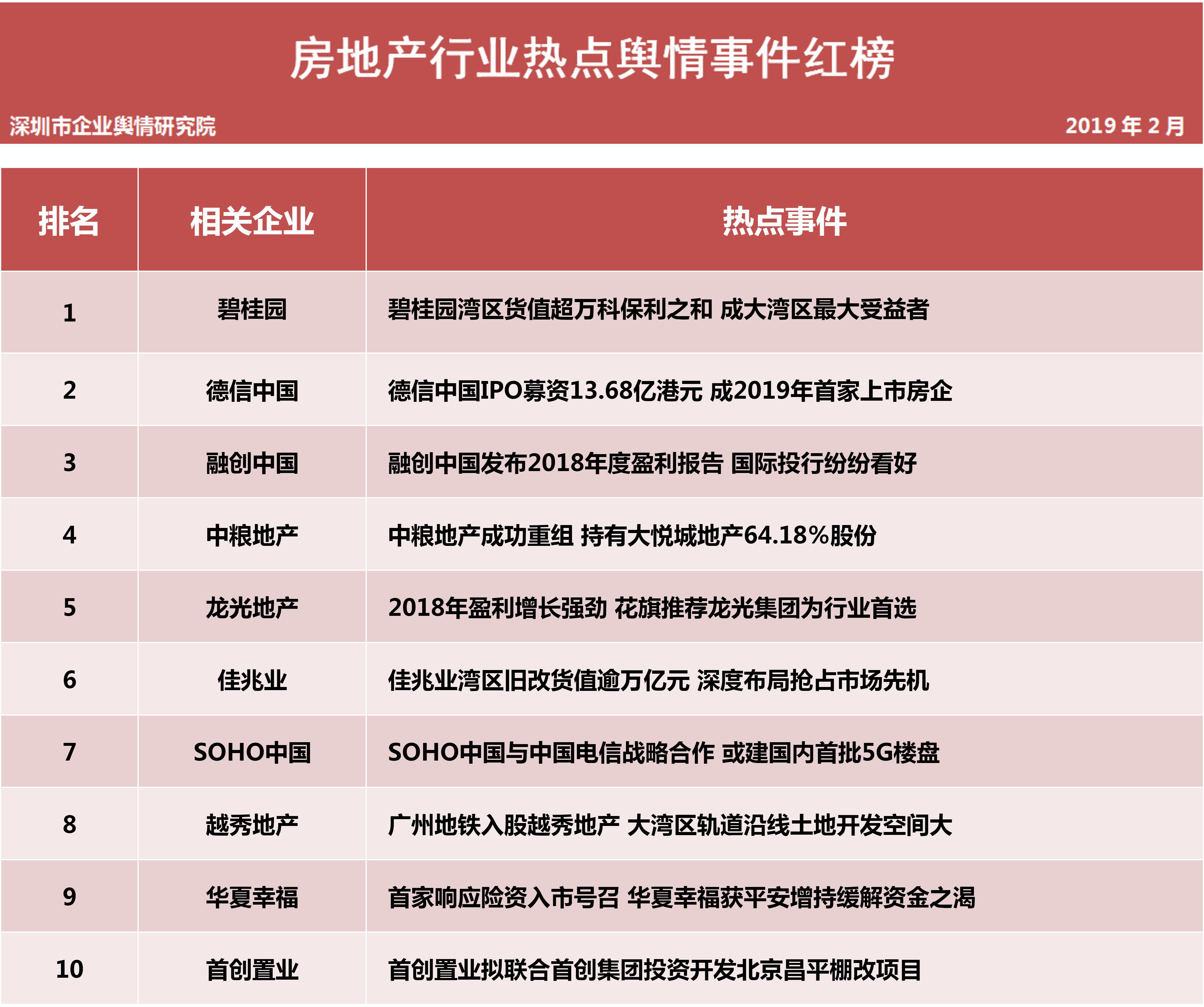 深圳新聞網2019年3月5日訊 (記者田志強 通訊員陳文光)3月5日,深圳企業(yè)輿情研究院發(fā)布第十三批企業(yè)輿情榜單。本次榜單重點聚焦房地產及醫(yī)藥保健兩個行業(yè)。房地產行業(yè)企業(yè)輿情榜單由房地產行業(yè)熱點輿情事件排行榜(紅、黑榜)及房地產企業(yè)公眾形象排行榜組成。