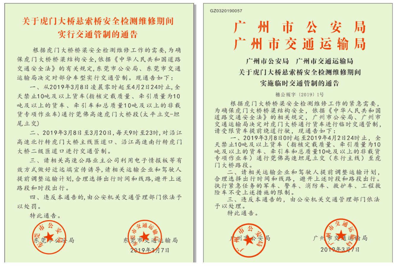 根據(jù)廣州市、東莞市兩地公安局和交通運(yùn)輸局通告,從2019年3月8日0時起至4月2日24時止,全天禁止10噸及以上貨車(指核定載質(zhì)量、牽引質(zhì)量為10噸及以上的貨車、牽引車和總質(zhì)量10噸及以上的非載貨專項作業(yè)車)通行莞佛高速虎門大橋段。