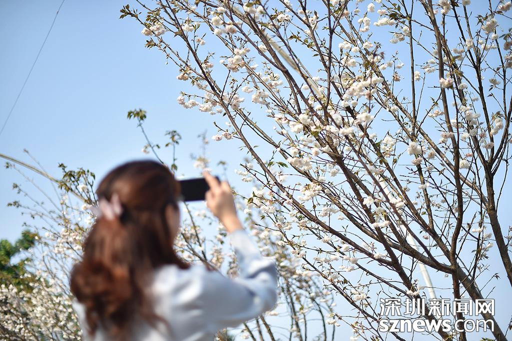 前來游玩的市民拿起手機(jī)拍下出來的櫻花
