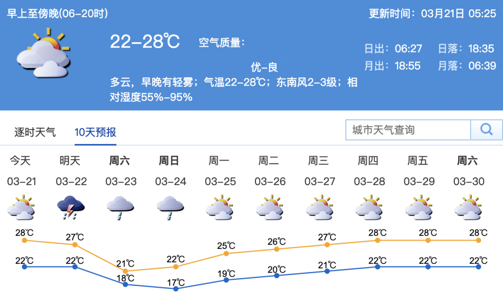 距離深圳平均入夏時間4月21日還有一個月,市民們也許已經(jīng)有了初夏般的感受。預計21日多云間陰天,早晚有輕霧,氣溫23~28 ℃。