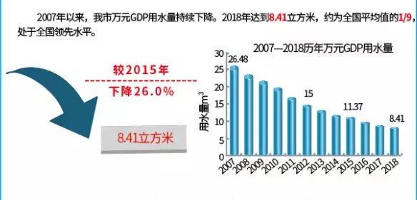 2、萬元GDP水耗由2010年的19.95立方米降至2018年的8.41立方米,萬元工業(yè)增加值用水量從14.15立方米降至5.22立方米,全市供水管網(wǎng)漏損率由2013年的12.72%降至2018年的10.66%。