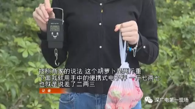 記者按照市民提供的線索,在通道上隨機選了一個攤位,購買了2斤胡蘿卜,可用自帶的便攜秤稱重后,發(fā)現(xiàn)缺了二兩。而在另外一個攤位上,記者買到的茄子也少了近3兩。