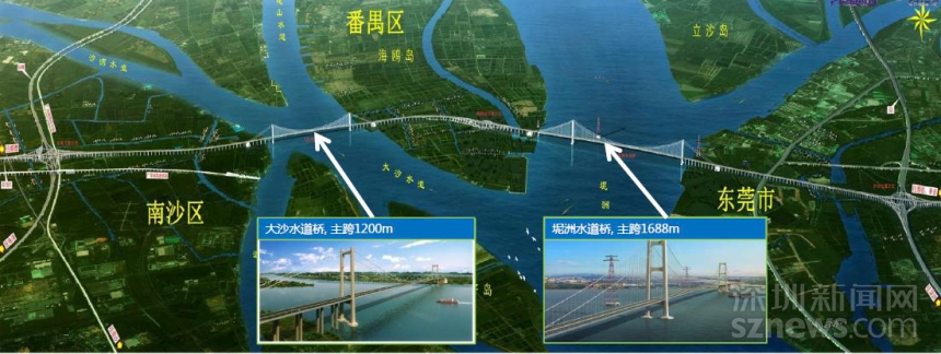 由廣東省交通集團投資建設(shè)的虎門二橋項目,全長12.89公里,雙向八車道,設(shè)計行車速度為100公里每小時,設(shè)計使用壽命100年。路線起于廣州市南沙區(qū)東涌鎮(zhèn),順接國道主干線廣州繞城高速公路南環(huán)段,同時與廣珠北線高速公路連接,經(jīng)廣州市南沙區(qū)、番禺區(qū)、先后跨越珠江大沙水道、海鷗島、坭洲水道后,穿越虎門港進入東莞市沙田鎮(zhèn),終點與廣深沿江高速公路相接,并預留與規(guī)劃中的河惠莞高速公路接口。