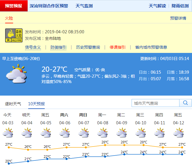 深圳新聞網(wǎng)2019年4月3日訊深圳今日氣溫20-27℃,多云,早晚有輕霧。4月3日至清明假期我市多云為主,降水少,氣溫高,空氣較干燥,沿海和高地間中有6-7級(jí)偏東風(fēng),氣象條件不利于降低火險(xiǎn)風(fēng)險(xiǎn),森林火險(xiǎn)預(yù)警信號(hào)將持續(xù)到清明假期。