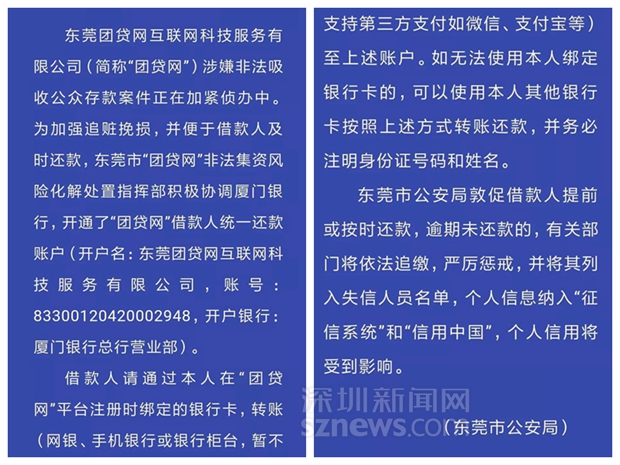 東莞警方開設(shè)統(tǒng)一還款賬戶敦促“團貸網(wǎng)”借款人還款