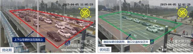 深圳交警采用遠程步控及路面手動控制及時疏散積壓排隊車輛,約中午12點路面車流量逐漸減少,路口交通恢復正常。