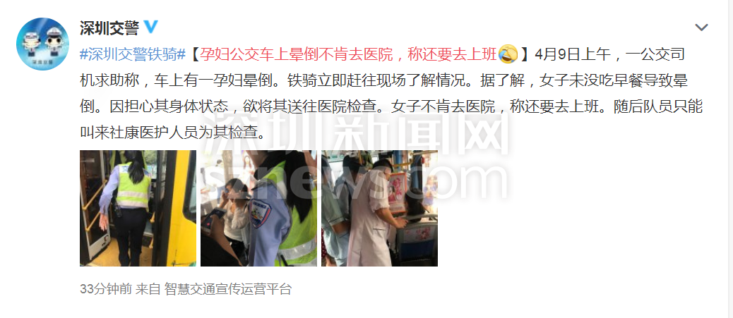 深圳新聞網(wǎng)2019年4月9日訊(記者 施冰冰)記者從“深圳交警”處了解到,4月9日上午,有公交司機(jī)求助稱,車上有一孕婦暈倒。鐵騎立即趕往現(xiàn)場了解情況。據(jù)了解,女子未沒吃早餐導(dǎo)致暈倒。因擔(dān)心其身體狀態(tài),欲將其送往醫(yī)院檢查。女子不肯去醫(yī)院,稱還要去上班。隨后隊員只能叫來社康醫(yī)護(hù)人員為其檢查。