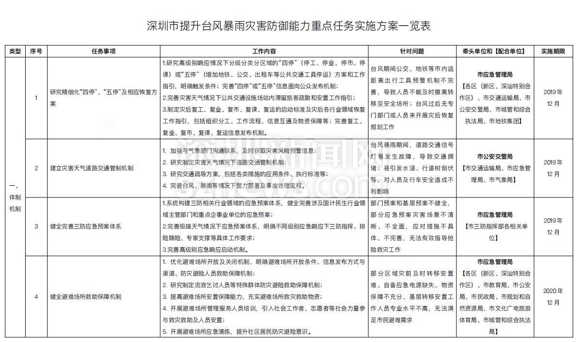 附:《深圳市提升臺風暴雨災害防御能力重點任務實施方案一覽表》