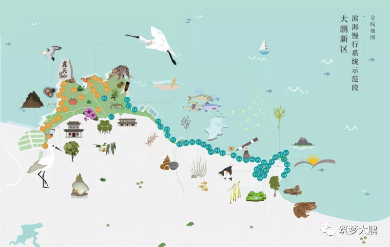 大鵬新區(qū)根據(jù)線路的地形、山海景觀、人文景觀的分布,確定了“打造‘兩線、三段、五大節(jié)點’的濱海生態(tài)自然課堂步道”。據(jù)新區(qū)建筑工務局負責人介紹,從新大河入海口到大亞灣海岸鹿咀懸崖,全長18.7公里的海岸線上分布著河流、山林、海灘、溪流、濕地等多樣生態(tài)系統(tǒng)。2017年7月,大鵬新區(qū)按照濱海慢行系統(tǒng)示范工程標準,動工建設新大-鹿嘴市政綠道。“兩線”指的是沿著海岸的濱海徒步路線和城市二號綠道線,兩條線之間的6.6平方公里土地將形成一座開放的郊野公園;“三段”分別為活力生活段、自然生態(tài)段和休閑旅游段;“五大節(jié)點”為山海綠畔、古廟遺風、東山凹、愛情灘、鹿咀山莊等自然景觀。