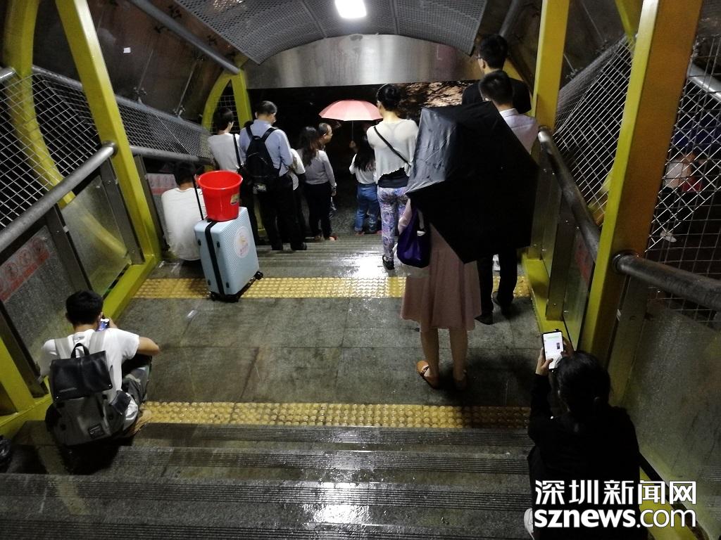 深圳暴雨特效開啟,市民紛紛進入躲雨模式。(記者 邱曉潔 攝于丹竹頭地鐵站)