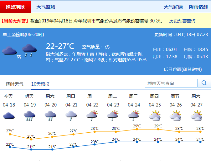 市氣象局預預計,深圳今天午后轉(雷)陣雨,夜間降雨趨于頻密,19日有暴雨局地大暴雨,并伴有雷電和短時大風,20日仍有局地暴雨。強降水時請注意遠離河道、低洼處等危險區(qū)域;天氣節(jié)奏變化快,請關注氣象臺發(fā)布的最新氣象信息。
