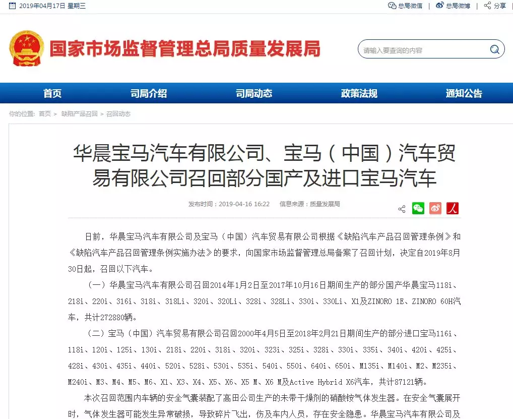 華晨寶馬汽車有限公司召回2014年1月2日至2017年10月16日期間生產(chǎn)的部分國(guó)產(chǎn)華晨寶馬118i、218i、220i、316i、318i、318Li、320i、320Li、328i、328Li、330i、330Li、X1及ZINORO1E、ZINORO60H汽車,共計(jì)272880輛。