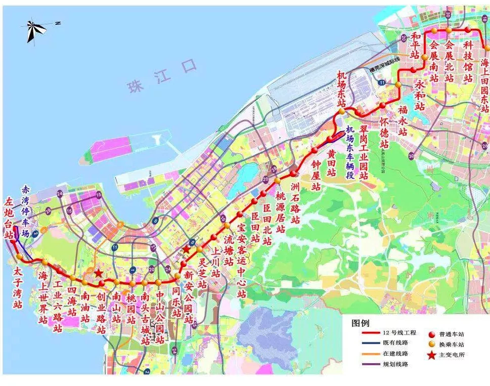 深圳地鐵12號線線路起自左炮臺站,終至海上田園東站;線路全長約40.54公里,全線采用地下敷設(shè)方式;共設(shè)站33座,其中換乘站18座。