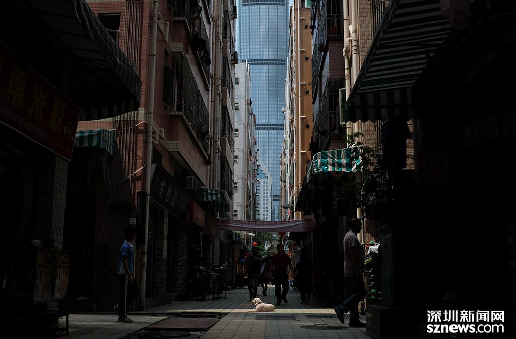 蔡屋圍內(nèi)部,后方為深城投大廈