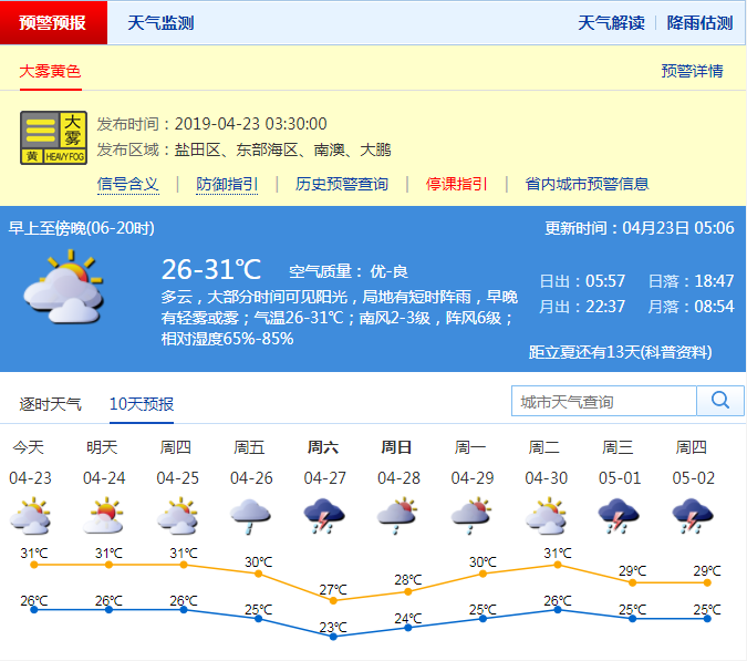 深圳新聞網(wǎng)2019年4月23日訊 深圳市氣象局預(yù)計(jì)23日多云,大部分時(shí)間可見陽光,中午前后天氣悶熱,局地有短時(shí)陣雨,早晚有輕霧或霧;25-31℃;輕微南風(fēng);濕度65%-85%。24-25日多云局地有短時(shí)陣雨,中午較熱;26日起天氣趨于不穩(wěn)定。