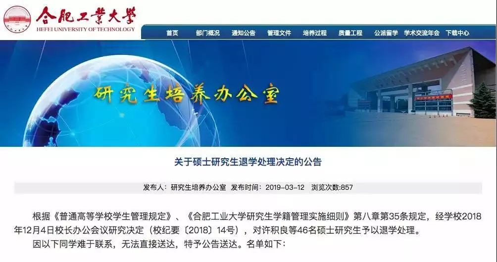 對46名碩士研究生予以退學處理,因其在學校規(guī)定的最長學習年限內(nèi)未完成學業(yè),或超過學校規(guī)定期限未注冊而又無正當理由,且未經(jīng)請假離校連續(xù)兩周未參加學校的教學活動。