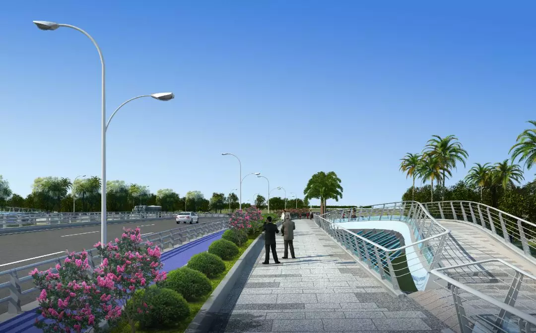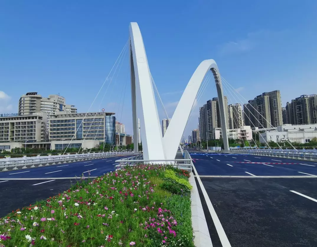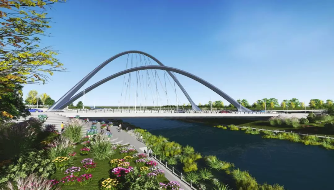 11號(hào)景觀橋以“融合”為主題,將流暢的線條融入景觀橋梁中,兩幅高低拱的線條無(wú)限延伸,猶如行云流水般瀟灑寫(xiě)意,一氣呵成;同時(shí),匯聚為一體的主拱又形成了“門”的形象符號(hào),迎接著八方來(lái)客。
