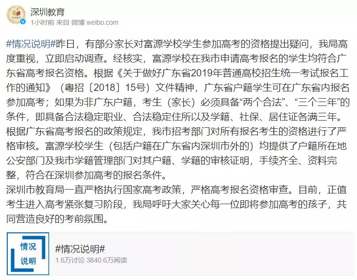 該回應稱:經(jīng)核實,富源學校學生均提供了戶籍所在地公安部門及我市學籍管理部門對其戶籍、學籍的審核證明,手續(xù)齊全、資料完整,符合在深圳參加高考的報名條件。