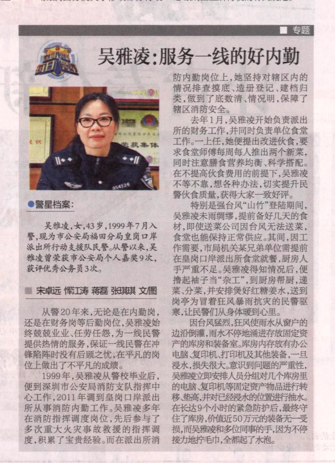 吳雅凌,女,43歲,1999年7月入警,現(xiàn)為市公安局福田分局皇崗口岸派出所行動支援隊民警。從警以來,吳雅凌曾榮獲市公安局個人嘉獎9次,獲評優(yōu)秀公務員3次。