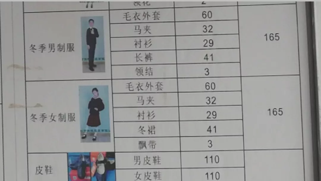 從龐女士發(fā)過來的圖片中記者看到,此前這家店的校服價(jià)格表中,小學(xué)學(xué)生冬季制服價(jià)格為165元。