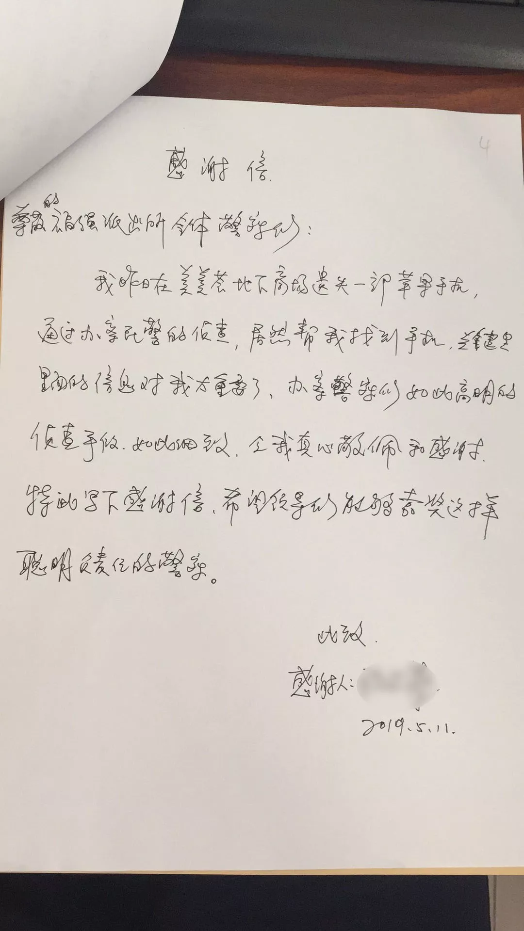 “手機里面的信息太重要了,辦案警察們如此高明的偵查手段,如此細致,令我真心敬佩和感謝!”5月11日晚,程女士在福強派出所的前臺激動地手寫了這封感謝信。