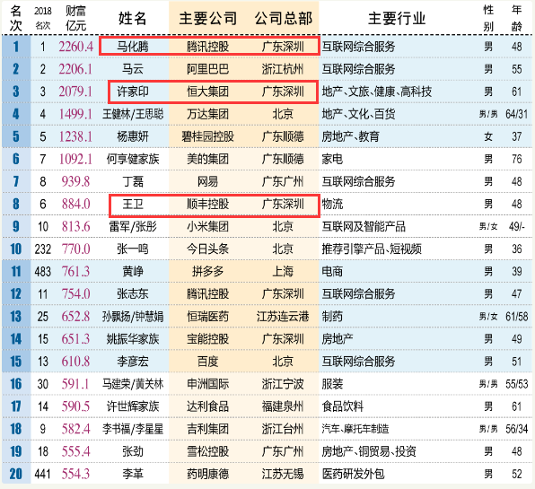 人均財富從去年191.3億元下降至162億元,前十名中深圳三人上榜