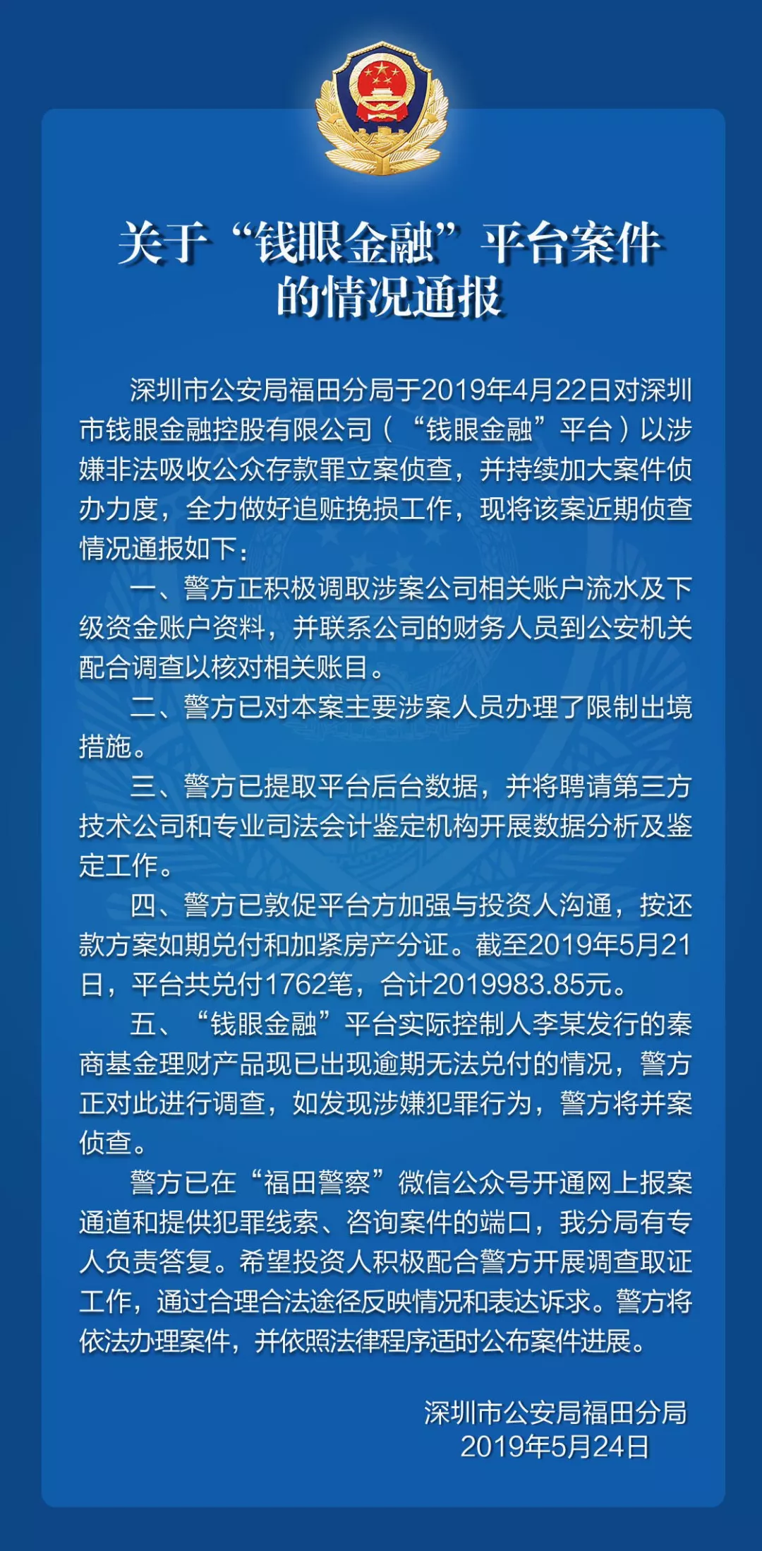 關(guān)于“錢眼金融”平臺的案件情況通報