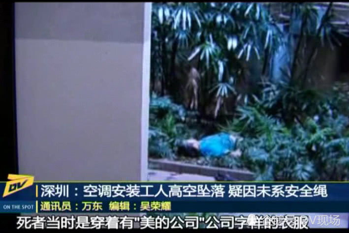 從拍攝的視頻可以看到,死者當(dāng)時(shí)是穿著有"美的公司"公司字樣的衣服,目擊者說(shuō),死者是在13樓安裝空調(diào)外機(jī)時(shí)出事的。