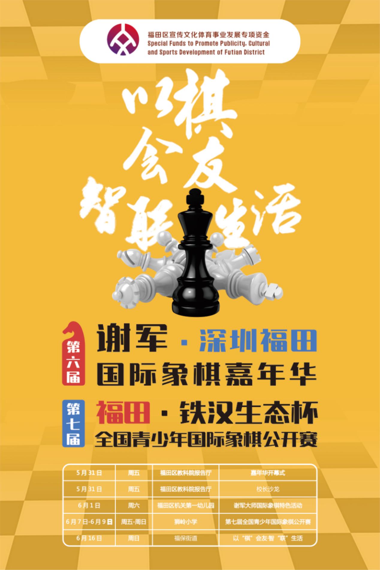 深圳新聞網(wǎng)5月29日訊 福田區(qū)一年一度的體育盛事——2019年第六屆“謝軍?深圳(福田)國際象棋嘉年華”暨第七屆“福田?鐵漢生態(tài)杯”全國青少年國際象棋公開賽即將于2019年5月31日在福田區(qū)教科院附屬小學(xué)隆重開幕。
