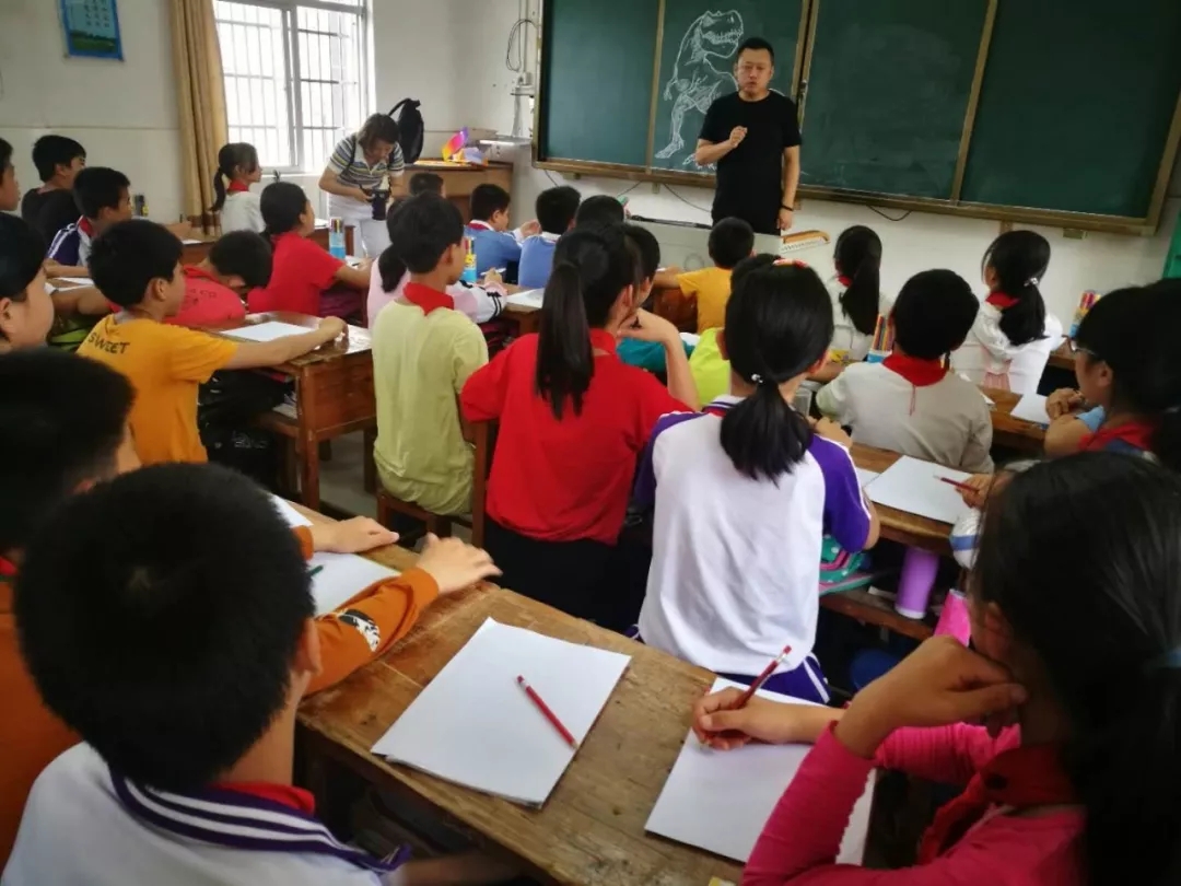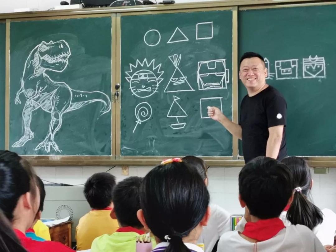 給同學(xué)們上美術(shù)課的是總社的美術(shù)編輯李新義老師。上課前,李老師一言不發(fā)地站在講臺(tái)上,拿起粉筆就在黑板上畫畫。下面的同學(xué)們一頭霧水地看著老師,七嘴八舌地猜他在畫什么: