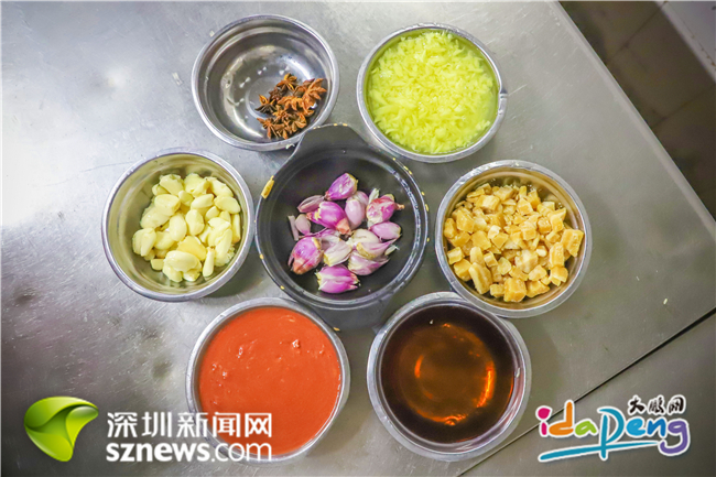 準備好五花肉和燜好的芋頭,五花八門的材料也準備輪番上場。歐石林將八角、料酒、醬油、鹽、姜蓉、蔥頭、蒜頭、南乳、片糖粒和花生油等細心地按比例分配在每個調料碟里,在他看來,一道好菜正是這些調料的“秀場”,但拿捏精準卻不是件易事。
