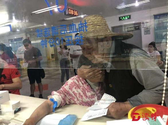 一名七旬老人陪老伴抽血檢查時,因為擔(dān)心其暈血,老人貼心地?fù)肀Ю习?,還捂住其眼睛不讓其看抽血。