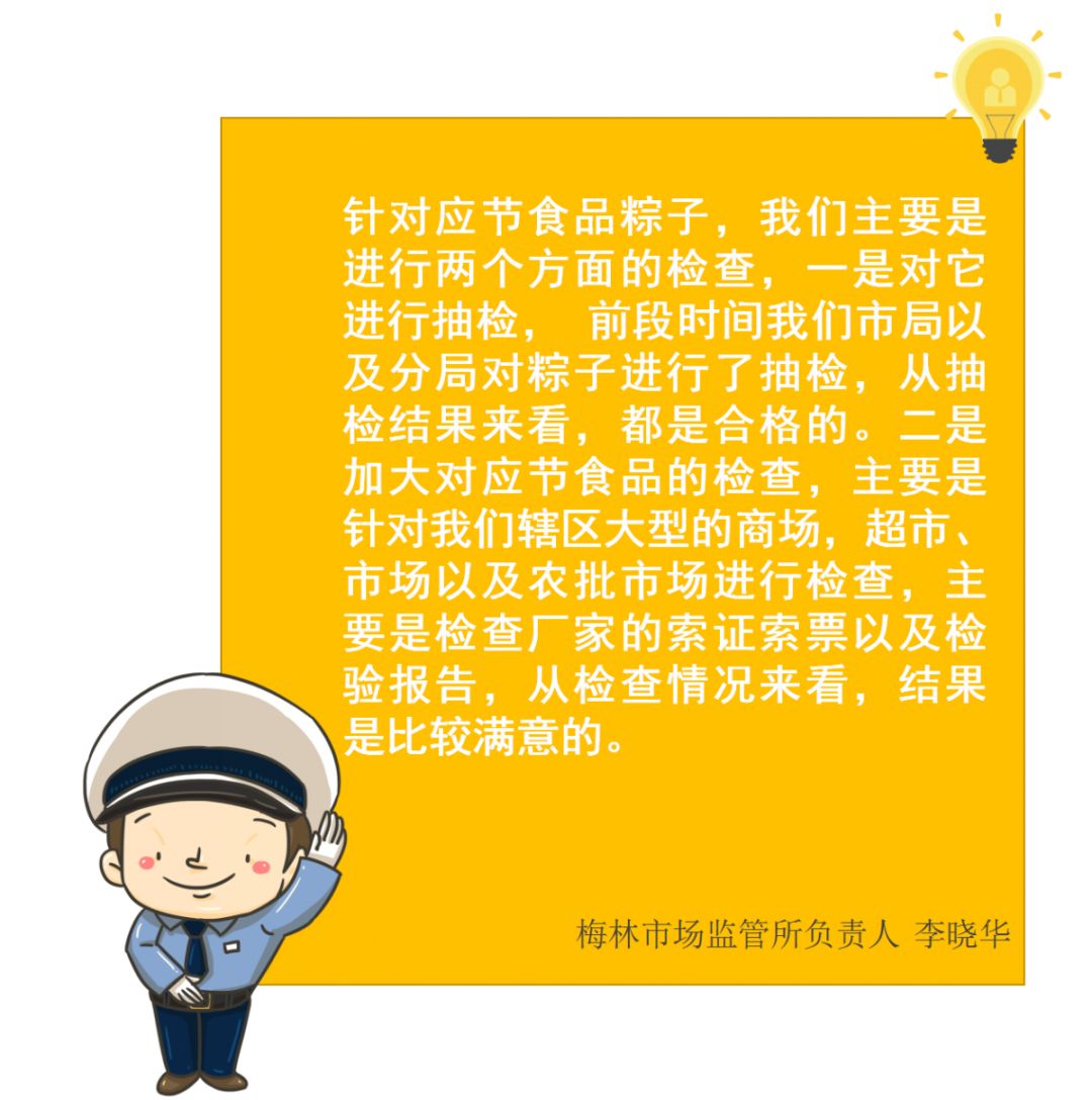 一年一度端午“粽”動員時刻到! 現(xiàn)在是不是想品嘗粽子的美味了? 肉粽肥瘦恰當(dāng)?shù)娜澫?/p> 蛋黃粽蛋黃留油的鮮潤 白粽沾綿糖的甜醇...... 于是總會來一場 甜咸粽黨battle 而有職業(yè)病的食安君只想關(guān)注安不安全 先關(guān)注下本期的【食安周報】 2019年食品安全抽樣檢驗情況通報 (第二十一期) 本次共抽檢生產(chǎn)、流通、餐飲環(huán)節(jié)應(yīng)節(jié)食品(粽子)200批次,涉及經(jīng)營主體123家次,共檢測食品指標(biāo)1738項次,全部檢測合格。 全部合格 深圳的小伙伴 看完這個抽檢 吃起粽子來,就更安心啦~ 抽檢現(xiàn)場 針對應(yīng)節(jié)食品粽子 執(zhí)法人員進(jìn)行兩個方面的檢查 戳視頻直擊檢查現(xiàn)場 現(xiàn)場還對制作粽子原料糯米 還有蔬菜進(jìn)行快檢 糯米我們檢測了黃曲霉毒素B1 沒有發(fā)現(xiàn)問題 蔬菜樣品(農(nóng)藥殘留)抑制率都低于50% 兩個都是合格的 可以放心吃 但是你懂得怎么吃嗎? 食安君這就告訴你 吃粽子的正確姿勢? 食用過量粽子而引發(fā)消化不良的情況時常發(fā)生老人、小孩和有胃腸道基礎(chǔ)疾病的人 要格外注意! 粽子好吃但要適可而止 粽子選購秘籍 說起買粽子,食安君又要老生常談了,一定要通過正規(guī)渠道購買哦,不要購買路邊的“三無”粽子。 同時注意查看外包裝的食品標(biāo)簽,如生產(chǎn)日期、保質(zhì)期、生產(chǎn)者名稱和地址、成分或配料表、食品添加劑、食品生產(chǎn)許可證編號等標(biāo)識是否齊全;并仔細(xì)檢查粽子包裝是否完整,真空包裝是否漏氣漲袋,散裝粽子有無變質(zhì)現(xiàn)象等。 健康吃粽小貼士 1.粽子大多屬于高糖、高鹽、高能量食物,不宜過量食用,尤其是糖尿病、三高、肝膽等疾病患者,一定要控制食用量。 2.吃粽子時,最好搭配一些蔬菜、湯羹等,既均衡營養(yǎng),又有助消化;同時,盡量少蘸醬油、砂糖等調(diào)味料,這樣會增加鈉和糖的攝入,不利于健康。 粽子好吃不貪吃 上周,我們向市民發(fā)出了 “你點名,我們來抽檢”的倡議, 我們的食品安全快檢車就來到福田梅林 食品安全快檢車 最后 食安君還是要提醒大家 外出就餐要到證照齊全 環(huán)境衛(wèi)生的餐館 學(xué)會看“笑臉”選餐廳 不選擇無證或衛(wèi)生環(huán)境差的路邊攤 歡迎大家積極參與食品安全監(jiān)督工作 關(guān)注每周食品抽檢信息公布 欄目:食安周報 民以食為先,食以安為天,食品安全是社會各界最為關(guān)注的重點。深圳市市場監(jiān)管局聯(lián)合《第一現(xiàn)場》欄目推出《食安周報》欄目,發(fā)布食品安全權(quán)威信息,為市民帶來第一手食安資訊。 播出時間:每周二晚上7:30 播出平臺:深圳廣電《第一現(xiàn)場》 每周抽檢信息通報 定期公布最新的食品及食用農(nóng)產(chǎn)品抽檢信息。 案件現(xiàn)場 直擊市市場監(jiān)管局執(zhí)法人員現(xiàn)場執(zhí)法,以案件解讀食品安全知識,增強現(xiàn)場感。 食品安全科普 對食品安全相關(guān)知識進(jìn)行科普,回應(yīng)近期食品安全相關(guān)謠言,提示食品安全風(fēng)險。 編輯整理:深圳食事藥聞 轉(zhuǎn)載請注明以上內(nèi)容