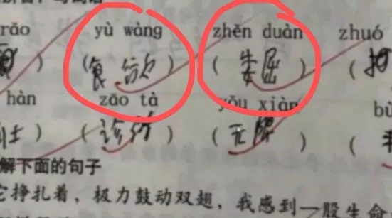 可是仔細(xì)一瞧,卻發(fā)現(xiàn)了蹊蹺。明明題目是讀拼音,寫(xiě)詞語(yǔ),可是孩子寫(xiě)的詞語(yǔ)和上面的拼音,完全對(duì)不上號(hào),老師卻依舊打了對(duì)勾。