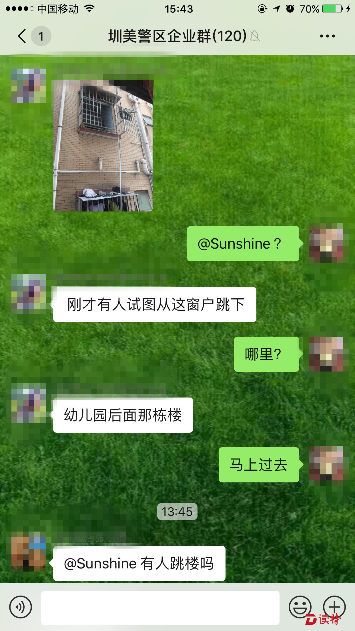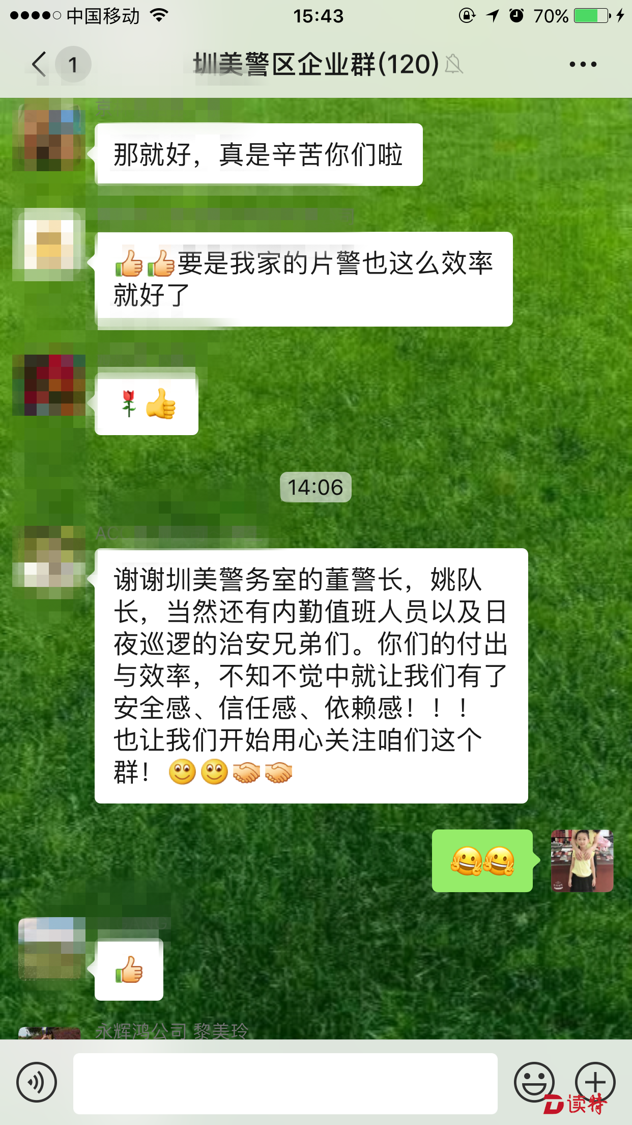 就在圳美警區(qū)隊(duì)員現(xiàn)場處置的過程中,微信群中的成員紛紛詢問事件情況。在了解到圳美警務(wù)室的隊(duì)員不到1分鐘就趕到現(xiàn)場后,大家對(duì)警區(qū)工作人員接連點(diǎn)贊。(讀特記者 王茂程 通訊員 胡澤瑜 溫小龍)