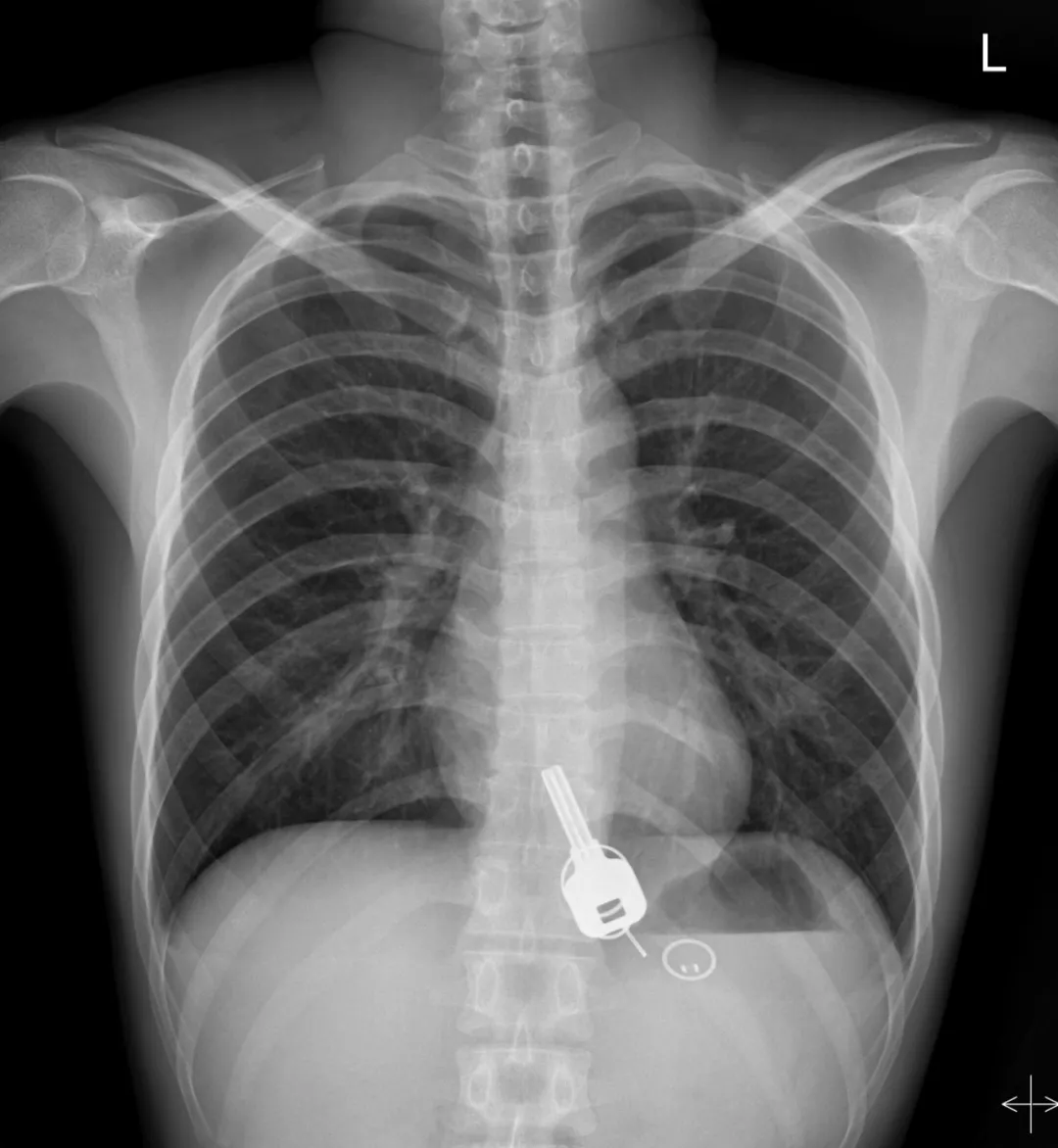 廣東東莞的常先生酒后回家找不到鑰匙,酒醒后他感到胸口疼痛,去醫(yī)院一查,發(fā)現一把鐵鑰匙、2個鑰匙扣、1個門禁牌清楚顯示在肚子胃區(qū)的位置上。